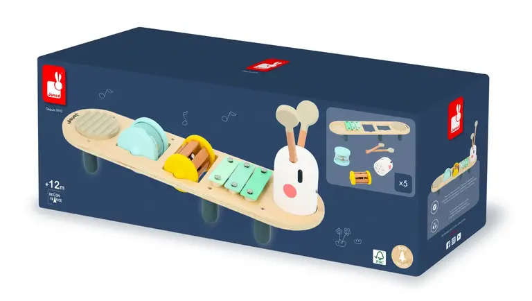 Create an accountThis musical stand has 5 instruments. The head is a maracas that doubles as storage for the beaters. On its back you will find a xylophone and a scratcher in soft colors, as well as 2 removable rattles. The first has 3 bells and the second is a rain stick. Your child can spin them on the base or shake them up and down. This musical stand is ideal for helping your child discover and experiment with different sounds in order to develop their hearing acuity. Certified wooden musical toy. For children aged 18 months and over.