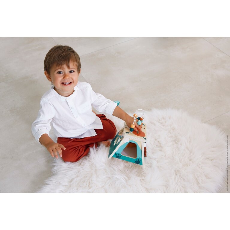 Your child will be able to retrieve the pieces easily thanks to a large opening on the side. The back panel has three gears to turn, the left side has a mirror and finally, on the top of this multi-activity volcano, there is a maze and an abacus with wooden beads. These 5 activities will help your child develop their fine motor skills, their dexterity, and their curiosity. FSC™ wooden toy.