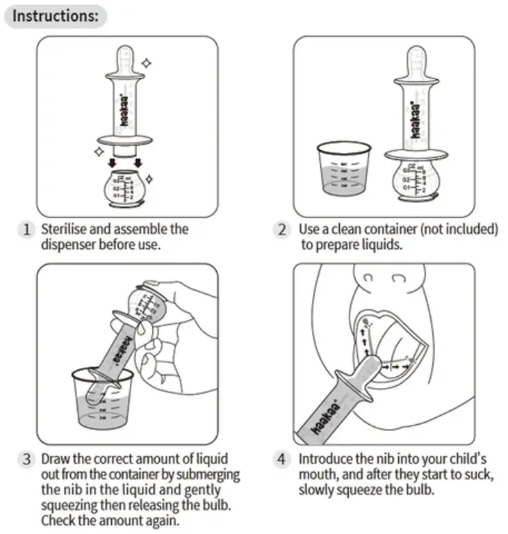 This Dispenser is specially designed to allow fuss-free measuring, filling, and feeding. The 100% medical-grade silicone bulb and body have clear measurements that are easy to read no matter which way you're holding it, and the wider suction base gives added stability on flat surfaces. The soft silicone nib has a rounded pacifier shape and protective shield so it's more readily accepted, protecting your baby's mouth, as well as featuring dual-angled ports to send liquid into their cheeks to prevent choking. What's more, the Dispenser disassembles with no trouble at all, making it a breeze to keep clean. To use, just squeeze the bulb to fill, then when your baby begins to suck on the nib, gently squeeze again to control the flow rate for uncomplicated and comfortable dispensing of liquids!