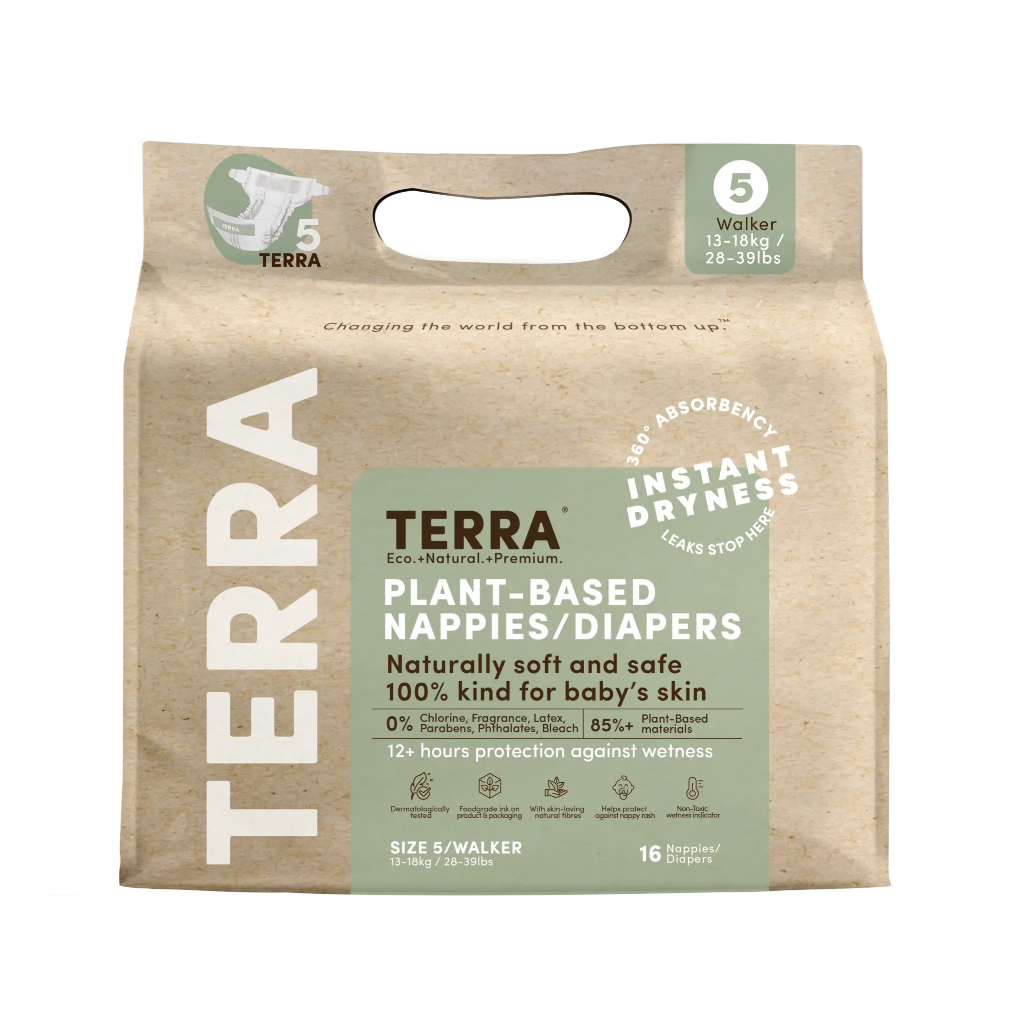 Create an accountNurture your baby's sensitive skin with Terra Plant-Based Diapers. Free from harsh chemicals and fragrances, our eco diapers are specially crafted with the best ingredients Mother Nature has to offer, combined with cutting edge manufacturing technology and human innovation to create the best performing and most sustainable diapers.